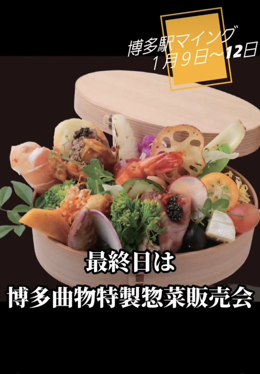 長く使える品質保証付の 博多曲物「玉樹」製 弁当箱に博多和牛やはかた地どり、旬の市内産鮮魚・野菜などをふんだんに詰め込んだ、この日限りの惣菜を限定販売します。
