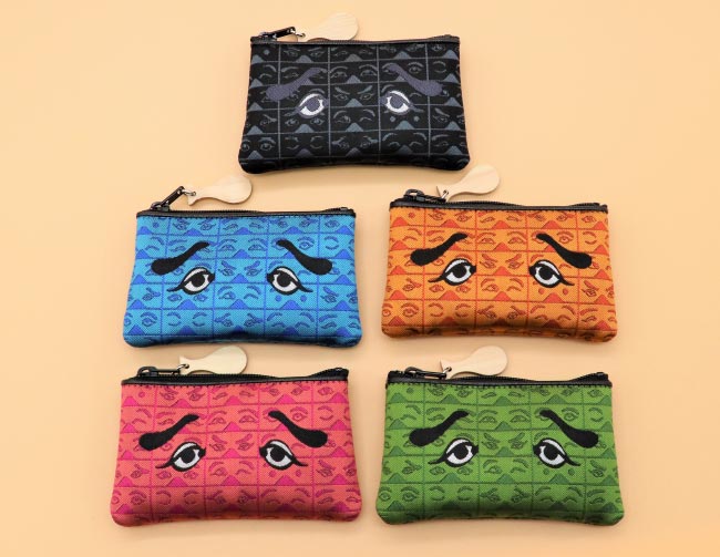 福岡市の郷土芸能「博多仁和加」をモチーフにした博多織の小銭入れ。ファスナースライダーには木製じゃもじのチャームも。