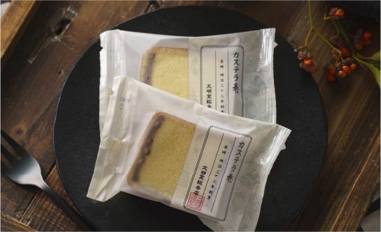 長崎のカステラを、文明堂総本店で愛され続けている三笠山の皮で巻きました。