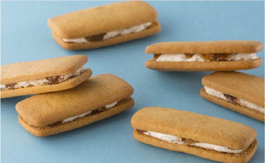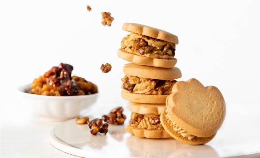 九州産生乳100%バター使用のクッキーに、キャラメルクリームと、キャラメリゼしたくるみをサンド!