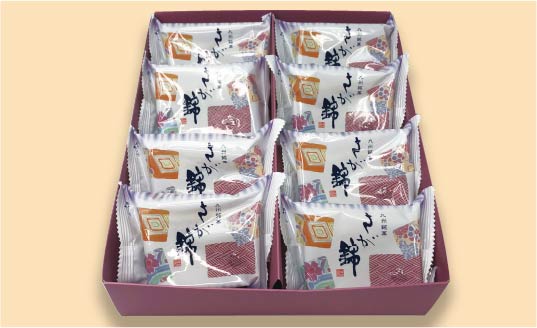 カステラ生地の上下をバームクーヘンでサンドした和洋菓子。村岡屋一番の人気商品です。