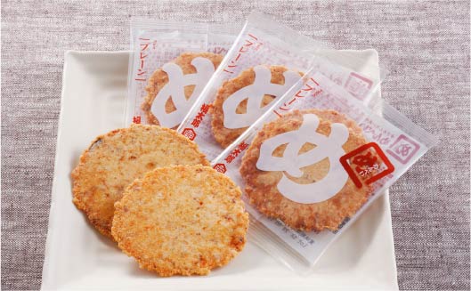 国産うるち米の粒感が残るせんべいに、旨みたっぷりの「めんたい辛みソース」を絡ませました。