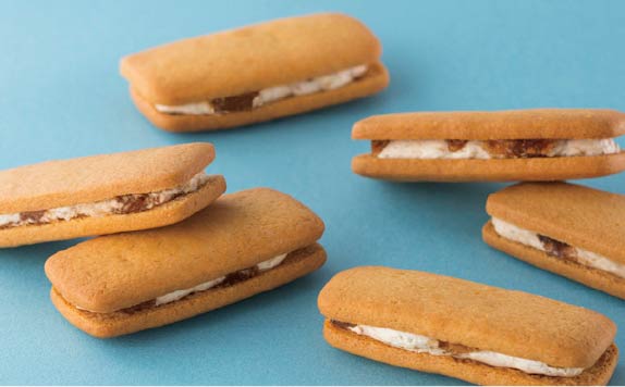 厳選したバターを贅沢に使ったクッキーに、焦がしキャラメルクリームと、キャラメリゼしたクルミをたっぷりサンドしました。