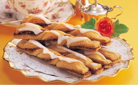 小豆を練り込んだカステラ生地の上下をバウムクーヘンでサンドした和洋菓子。村岡屋一番の人気商品です。