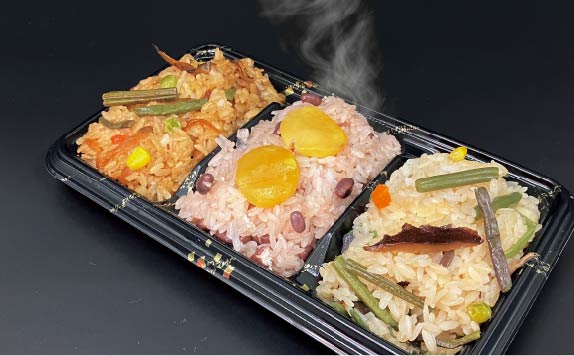もち米100%ひよく米使用。栗おこわ、山菜おこわ、はかた地どりおこわの3種類。