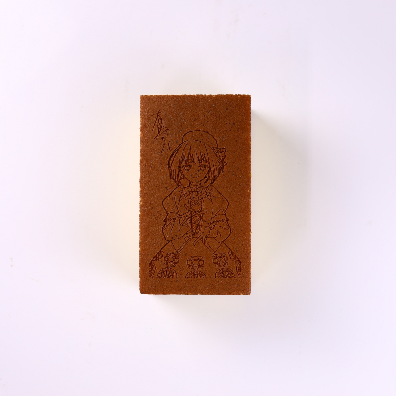 文明堂総本店自慢のカステラに、焼き印で有馬かなさんのデザインを描いております。