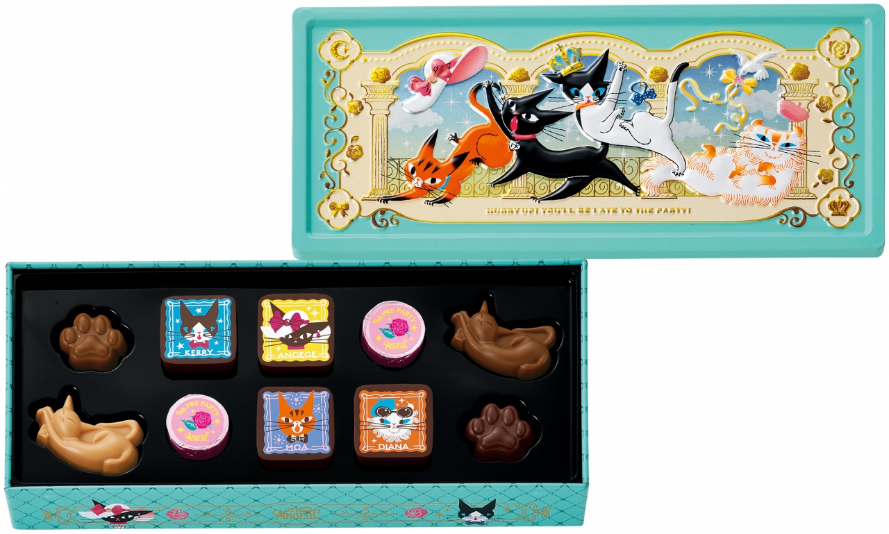 パーティー会場に向かう猫たちをデザインした缶に4匹のプリントチョコや猫型チョコレート、肉球チョコレートを詰め合わせました。